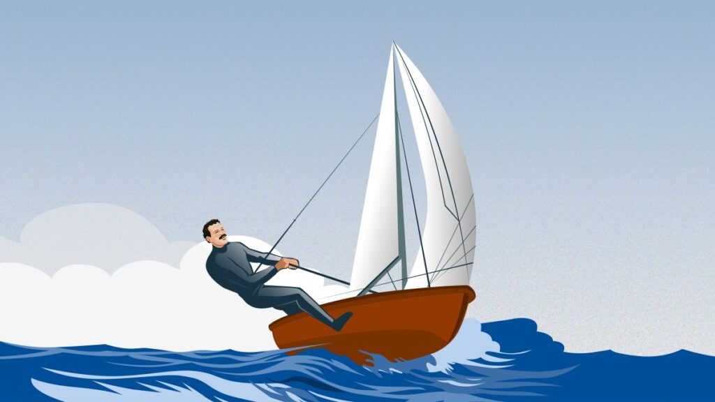 Con 35 nodi di potenza, comincia a soffiare sul mare e sulle imbarcazioni, che sembrano fogli danzanti, ballerini ubriachi. Le onde si fanno sempre più costanti, alte e minacciose. Il nostro eroe tiene botta e continua la regata. La medaglia è a portata di mano e l’inaspettato cambio climatico non potrà e non dovrà rovinare i piani del nostro atleta.