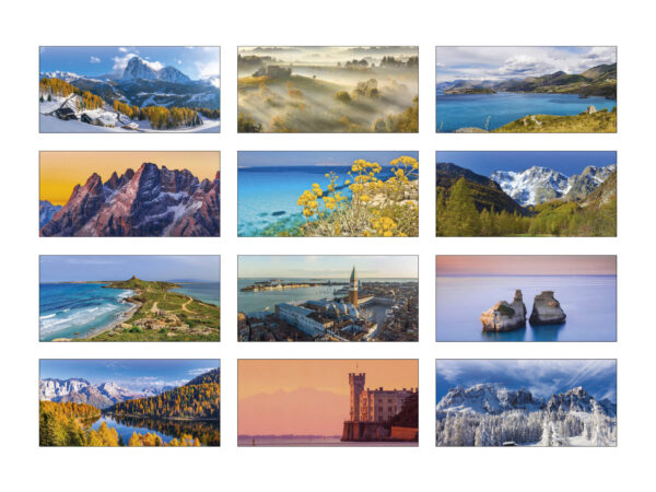 A Christmas gift set with a coordinated theme, comprising a panettone box, a diary, a desk calendar, a wall calendar and a greeting card with silver foil stamping. In-house graphic design for a harmonious and striking look.